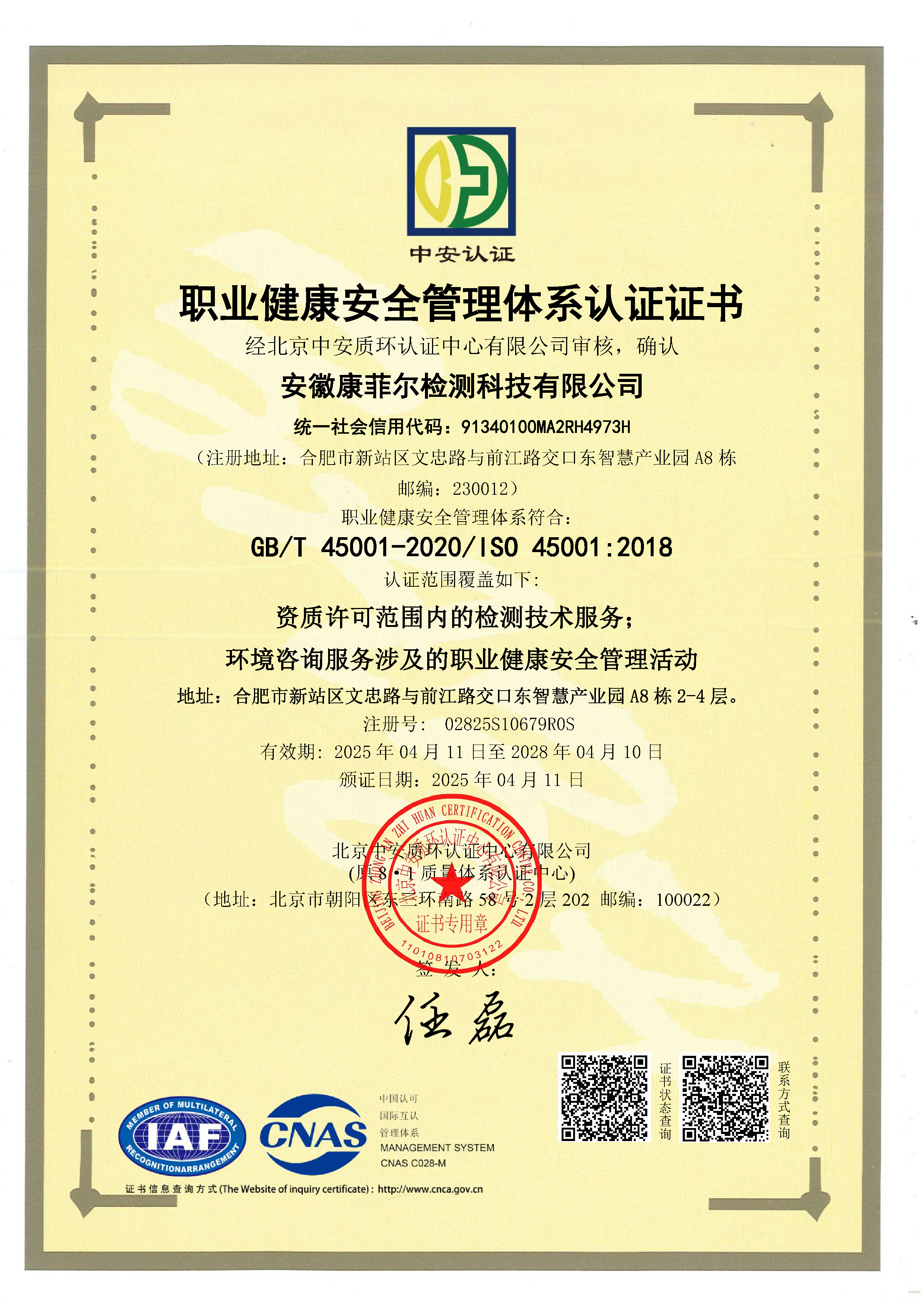 職業健康安全管理體系認證證書